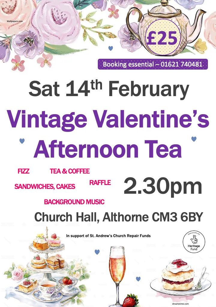 Saturday 14 February: Vintage Valentine's Afternoon Tea 2:30 pm. See flier for more info